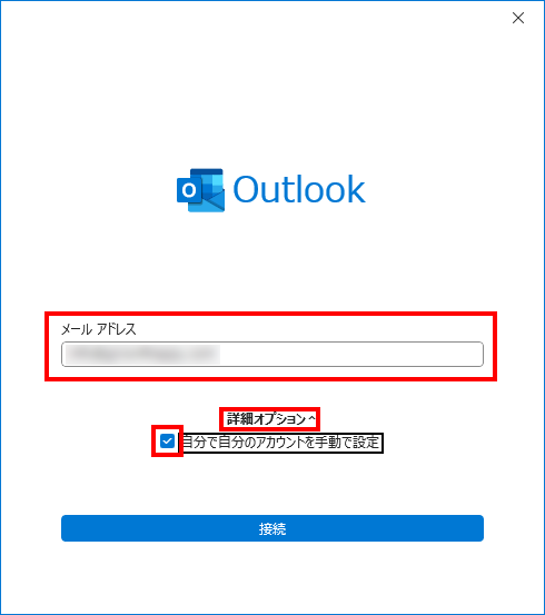 - メールアドレスを入力し、『 詳細オプション 』をクリックします。 『自分で自分のアカウントを手動で設定』にチェックを入れ『 接続 』をクリックします。