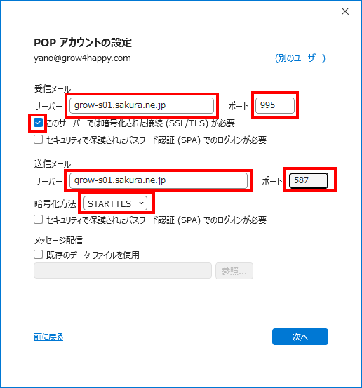 受信メール サーバー grow-s01.sakura.ne.jp 受信メール ポート 995 このサーバーでは