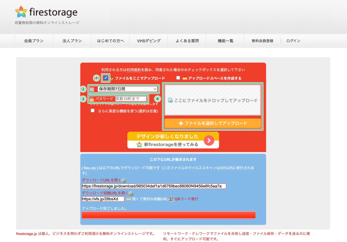 ④「ここにファイルをドロップしてアップロード」に手順1で作成されたファイルをドラッグアンドドロップ - 画面の下にある水色枠に表示される「ダウンロード短縮URL」をコピーして、送信相手にメール等でお知らせください。